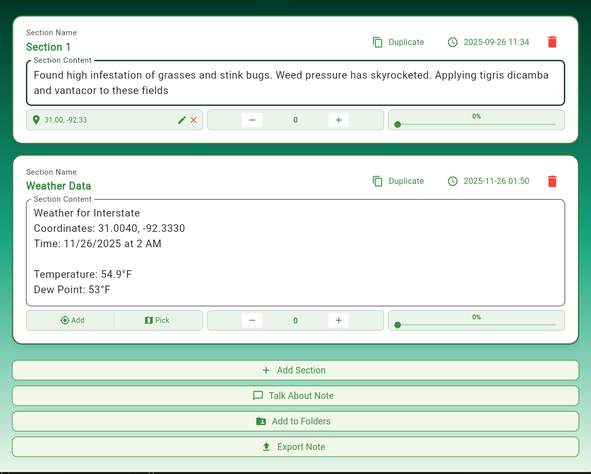 → Our AI automatically records the field note with proper formatting, field references, and metadata.