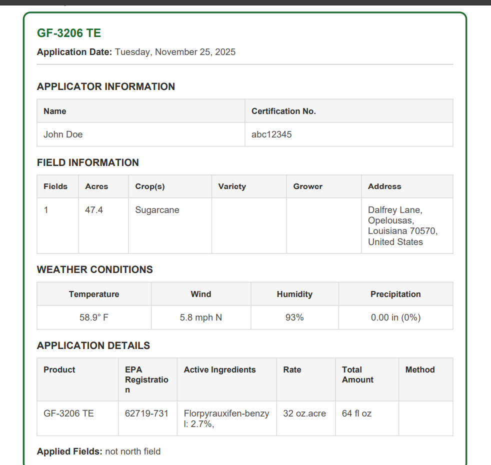 Document applications in EPA-approved format with instant label lookup, rate calculations, and compliance tracking.