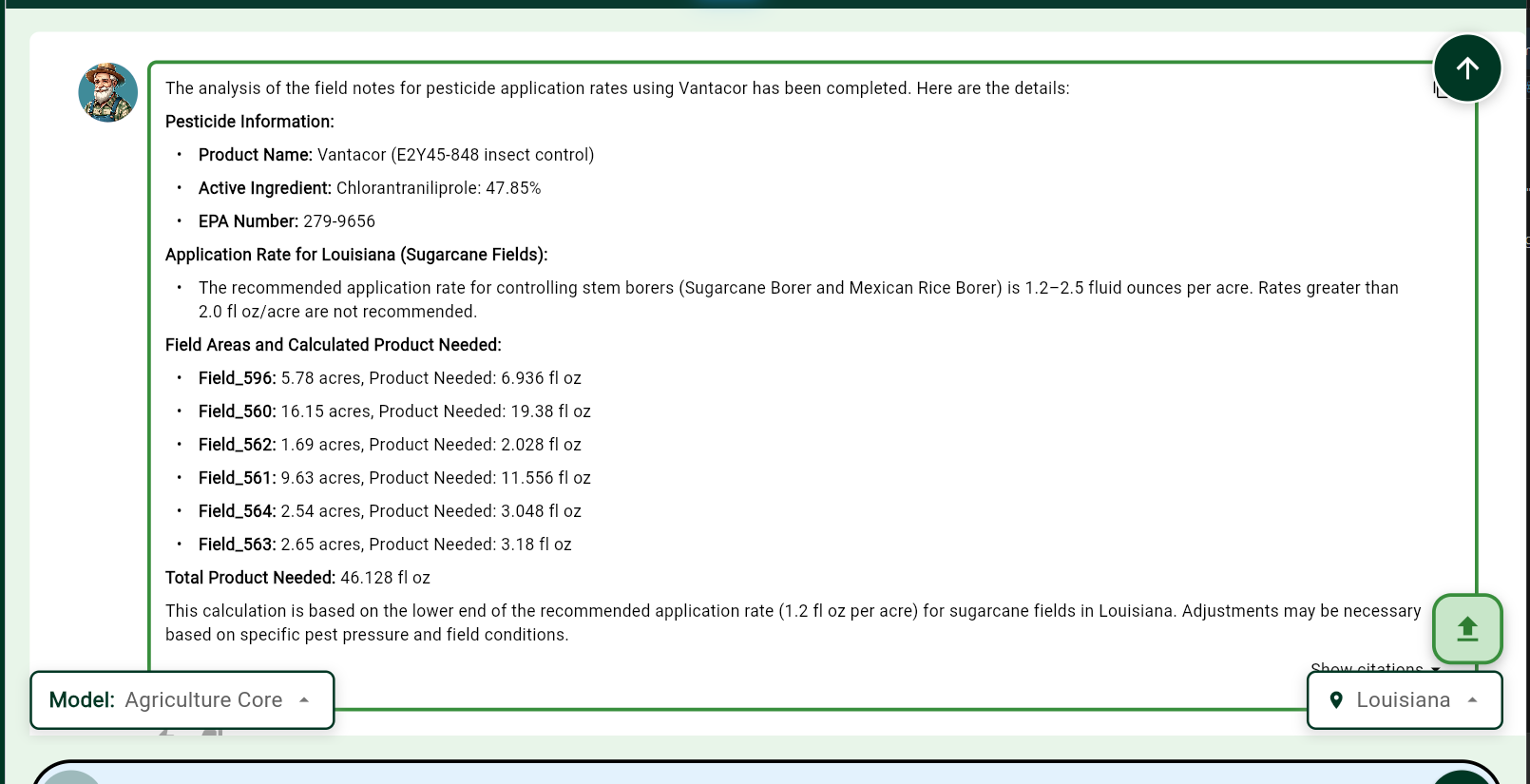 Every answer includes citations back to pesticide labels, AgCenter data, and state regulations.